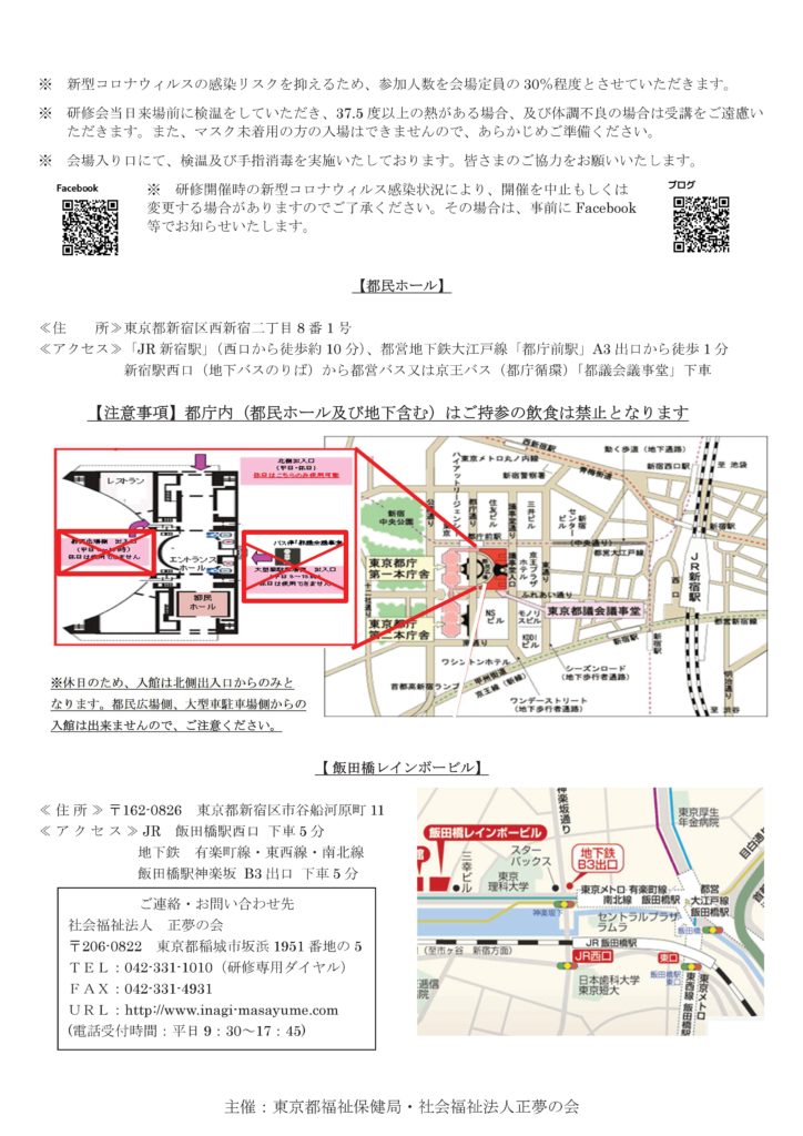 (2)研修会当日来場前に検温をしていただき、37.5度以上の熱がある場合、及び体調不良の場合は受講をご遠慮いただきます。また、マスク未着用の方の入場はできませんので、あらかじめご準備ください。