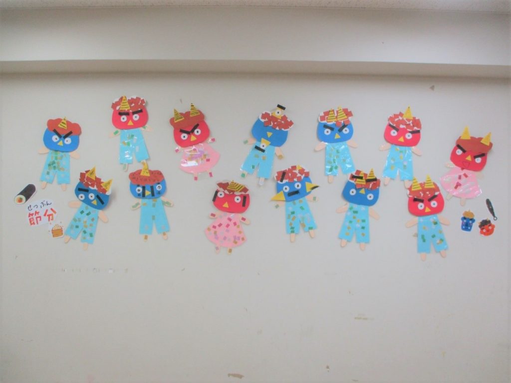 年長クラスの2月の壁面です😆!眉毛がキリッとしたかっこいい鬼や、眉毛が垂れたふにゃっと優しい鬼…お子さんそれぞれの色が出ている素敵な鬼が完成しました👹節分当日はこのお面を被り、悪い鬼を退治!黄色いボールを豆に見立て、「おには~そと~!ふくちは~うち~!」と鬼に向かって投げました😊クラスみんなで季節行事を楽しむことができました😊⭐